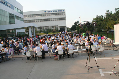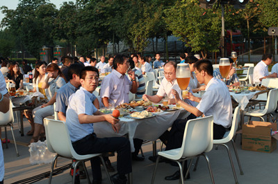 24日下午,公司辦公樓前,擺放著一排排桌椅,員工們從餐廳端著盛滿豐盛食物的餐盤,擺放在餐桌上。南面的舞臺上,工作人員在緊張的調(diào)試音響,兩只紅色的氫氣球飄揚(yáng)在空中,在蔚藍(lán)的天空映襯下,格外的鮮艷,為整個會場增添了喜慶的氣氛。
